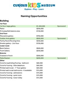 We have been fortunate to receive the support of area businesses, community leaders, and patrons of the Curious Kids’ Museum throughout the years, and hope that generosity will continue. Consider donating to our capital campaign “Building Curiosity- Play a Part, Fund the Fun!” and help expand the educational horizons of all children for generations to come.
